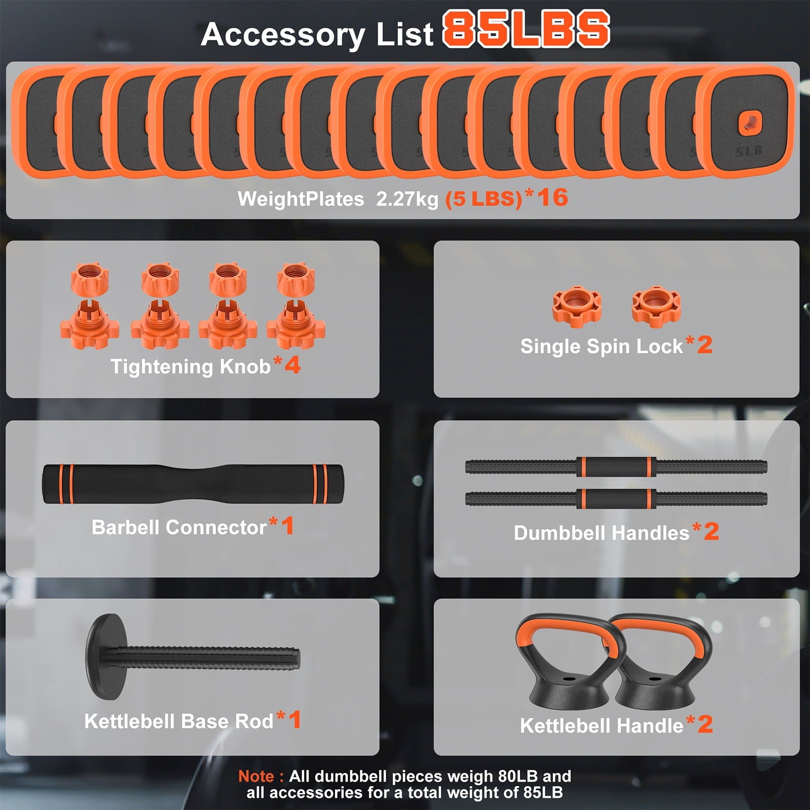 • Weight Plate: 5lbs × 16