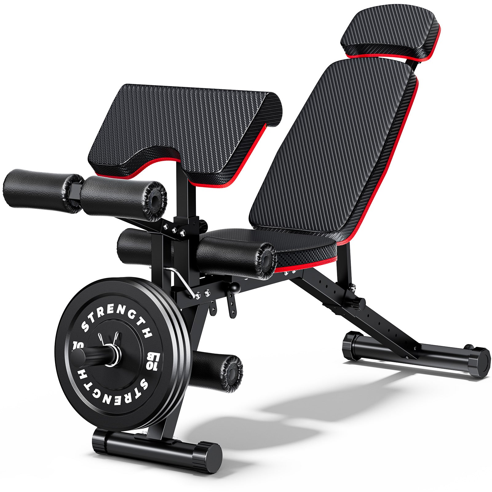 The GIKPAL adjustable weight bench. Featuring 6 customizable components, including adjustable parameter-- backrest (10 levels), headrest (7-9 inches), seat (4 levels), preacher curl pad (3 levels), lower hook feet (2 levels), handle (3 gears) .this workout bench ensures a tailored fitness routine. Crafted from high-quality steel and reinforced with a sturdy triangle structure and safety locks, it provides unwavering stability for all your exercises. With its 2 inches thick high-density foam PU leather construction, this weight bench offers both comfort and durability, supporting up to 900 pounds. Perfect for home gyms, it enables a wide range of workouts targeting chest, shoulders, back, and abdominals. Plus, its built-in transport wheels ensure effortless mobility. Weighing 24.5 kilograms, this fitness essential measures 70.9"D x 20.5"W x 49.2"H.