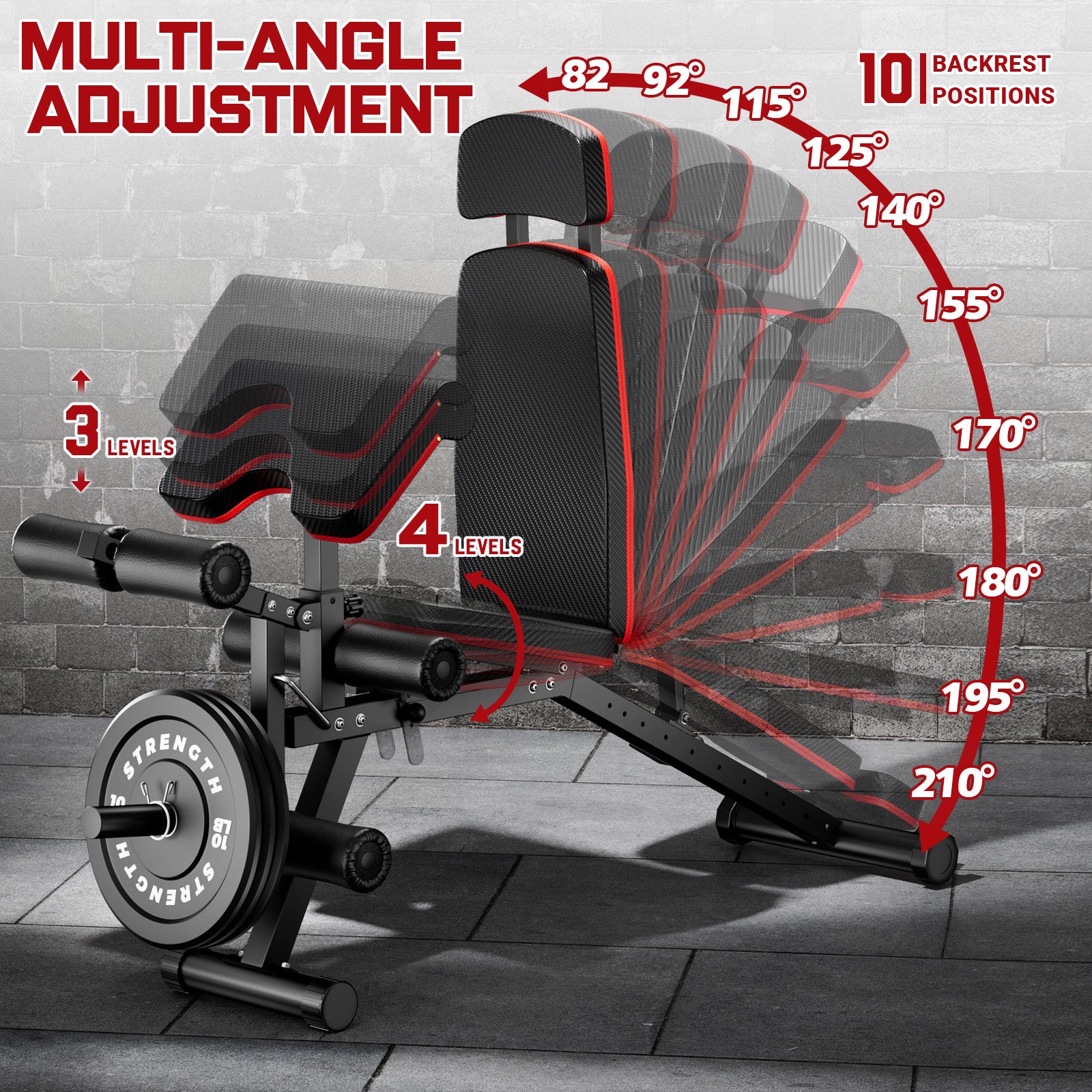 • Human Body Mechanics Design: Features a barbell rack adjustable to 10 different levels, accommodating various body sizes The backrest can tilt, drop, or lie flat, allowing for a range of full-body exercises