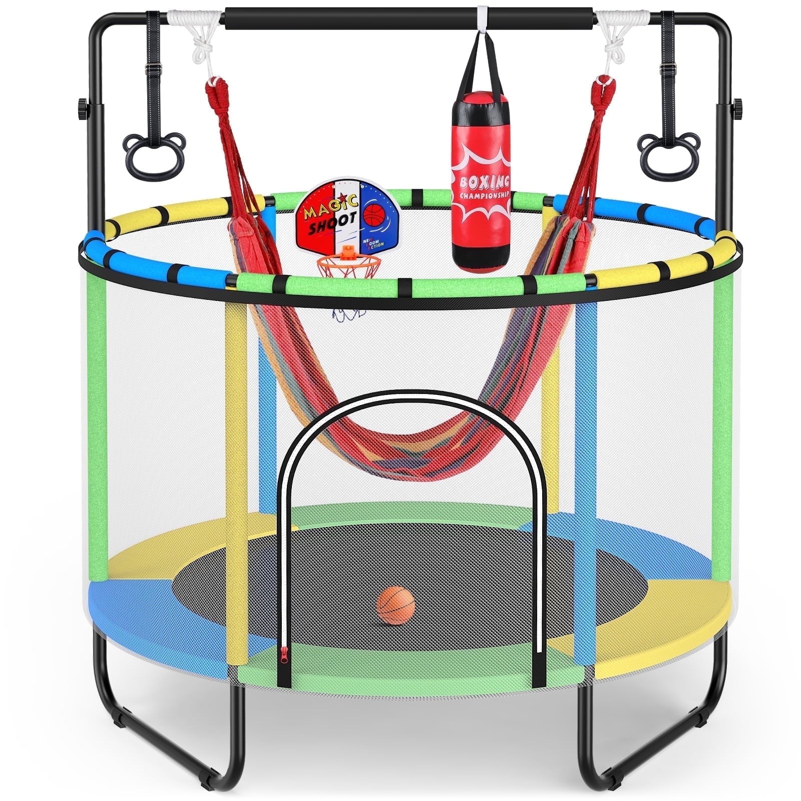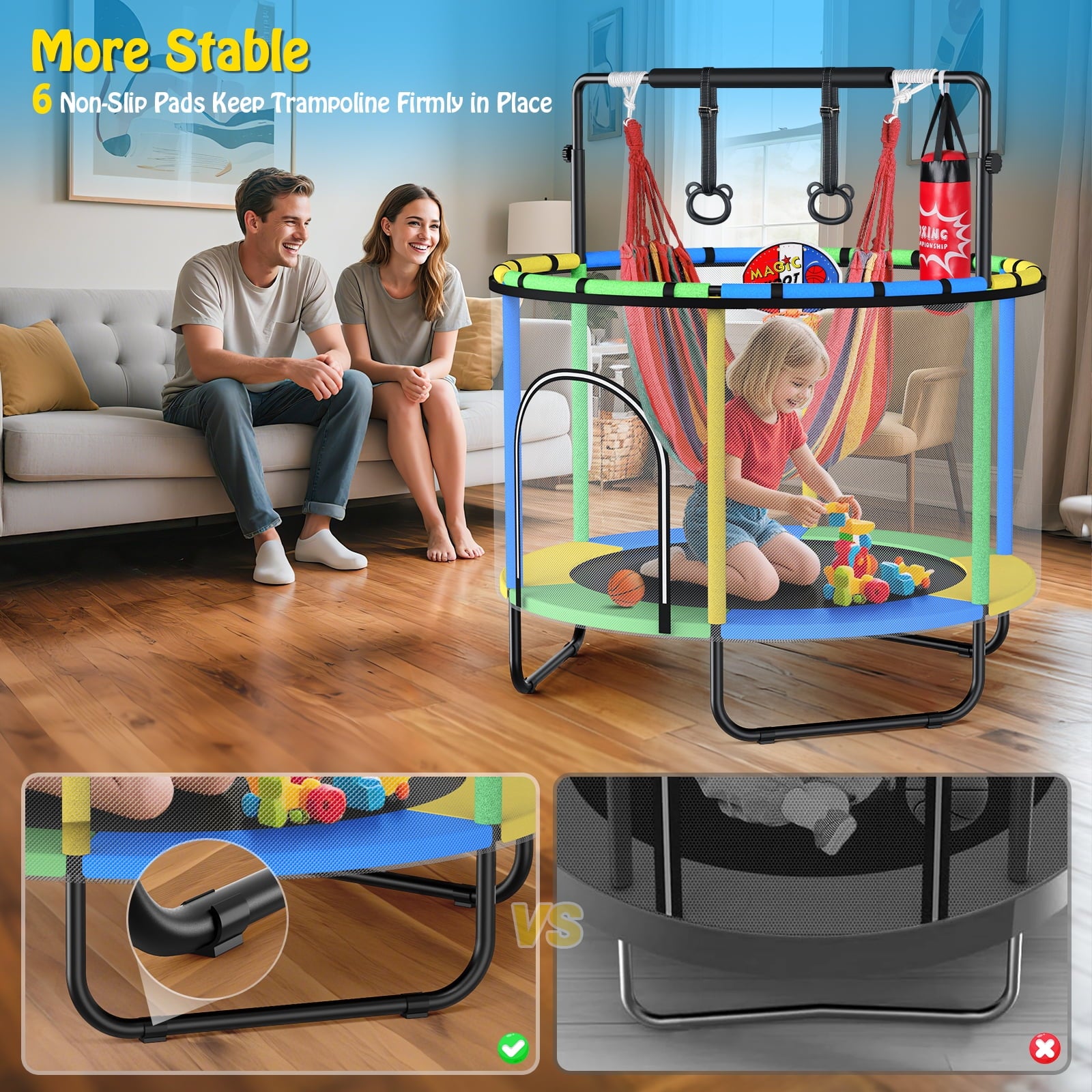 • 🎉 6-in-1 Fun & Fitness Accessories Included: Maximize playtime with a mini basketball hoop, mini basketball, swing, sandbag, gymnastic bar, and rings! This 60" kids trampoline transforms into an active playground, encouraging exercise, coordination, and endless fun for ages 1+.
