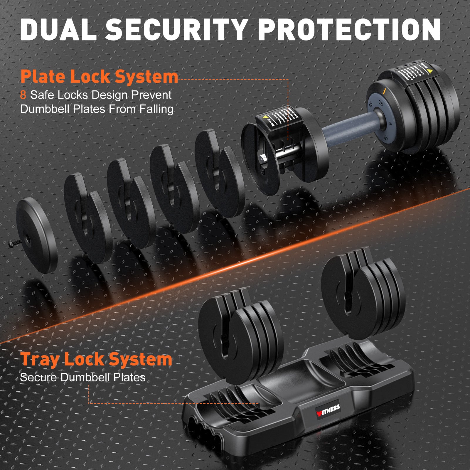 • 【Double safety Structure Design】The 8-lock structure ensures that the weight plates remain securely in place during your workout, while the bottom safety lock provides additional stability.