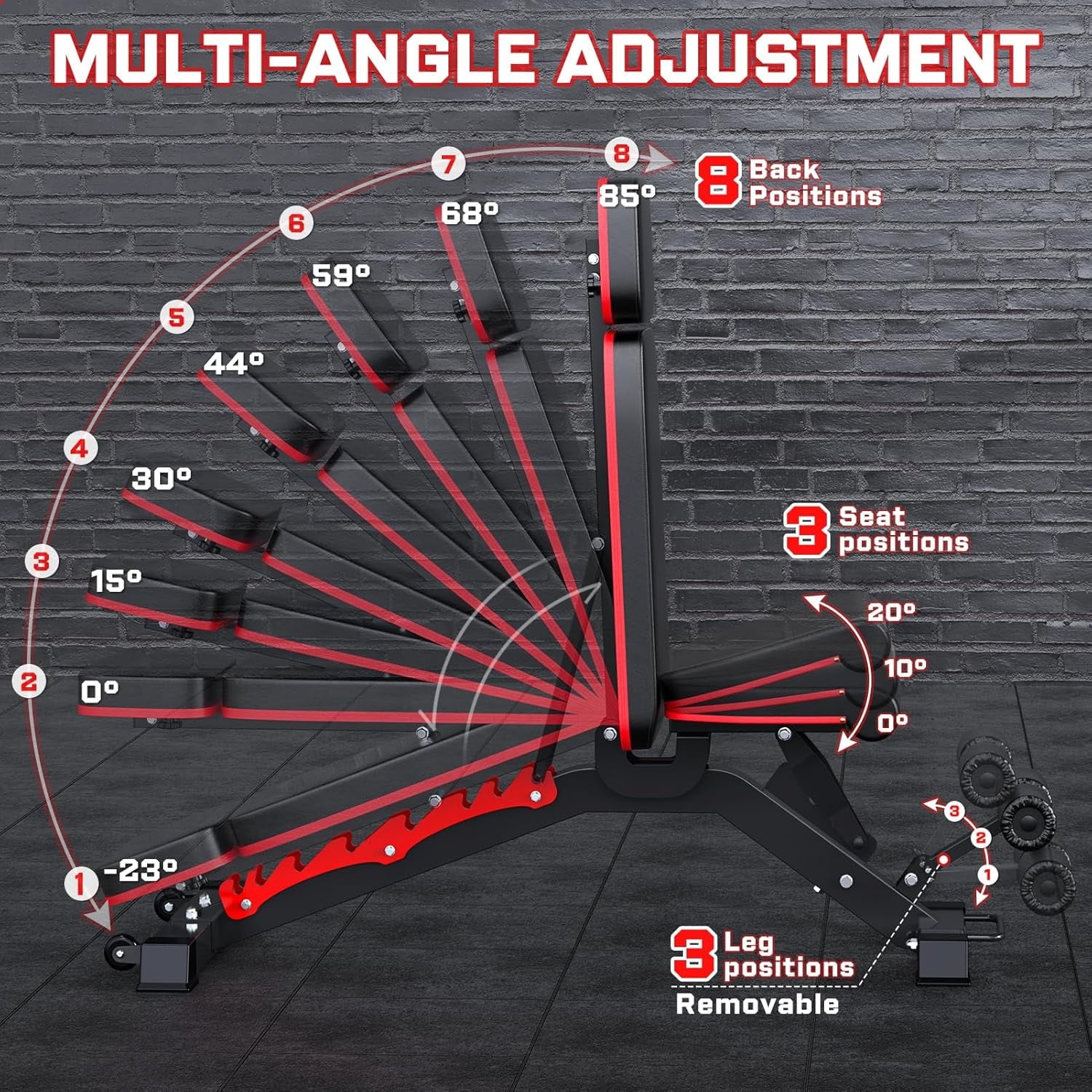 • Multi-function Adjustment: The fitness bench has 8 Positions backrest adjustments, 3 seat adjustments, and 3 leg position adjustments, which can perform full-body muscle exercises to exercise various muscle groups, such as core, arms, shoulders, back and chest, etc.