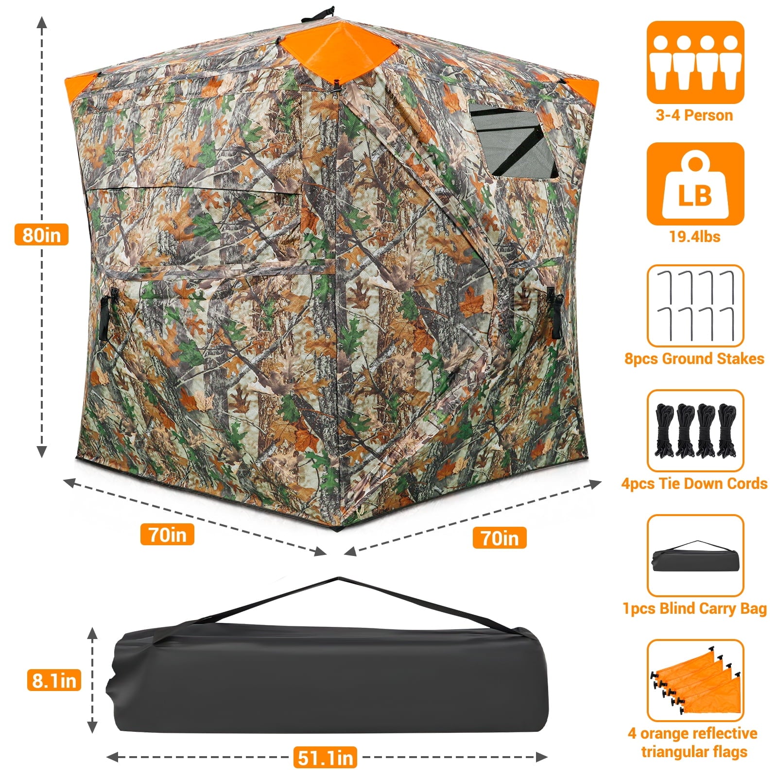 This professional hunting blind can become one with the surrounding habitats, providing you with good hunting environment and gives the hunter 270 degrees of full view shooting access. This camo blind made of three layers of composite perspective mesh (PU layer +210D Oxford fabric + perforated perspective mesh), ideal for firearm hunting and offers portable and compact concealment. And it comes with ground stakes and tie-downs for further stability to withstand strong wind. GIKPAL Hunting Blind with 3 large windows, all equipped with shoot-through mesh window coverings.The hunting blind is made of durable, spring steel construction and features shadow guard and durable weatherproof and wear-resistant material for longer use. The Ground Blind can conceal at most 4 person. Organize it in the carrying bag after hunting.