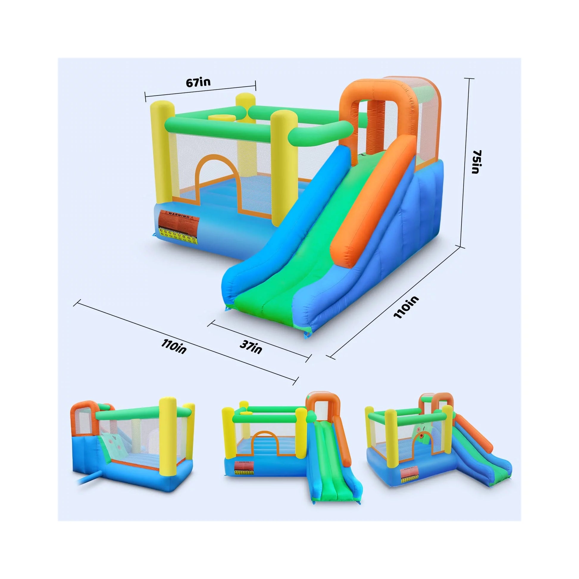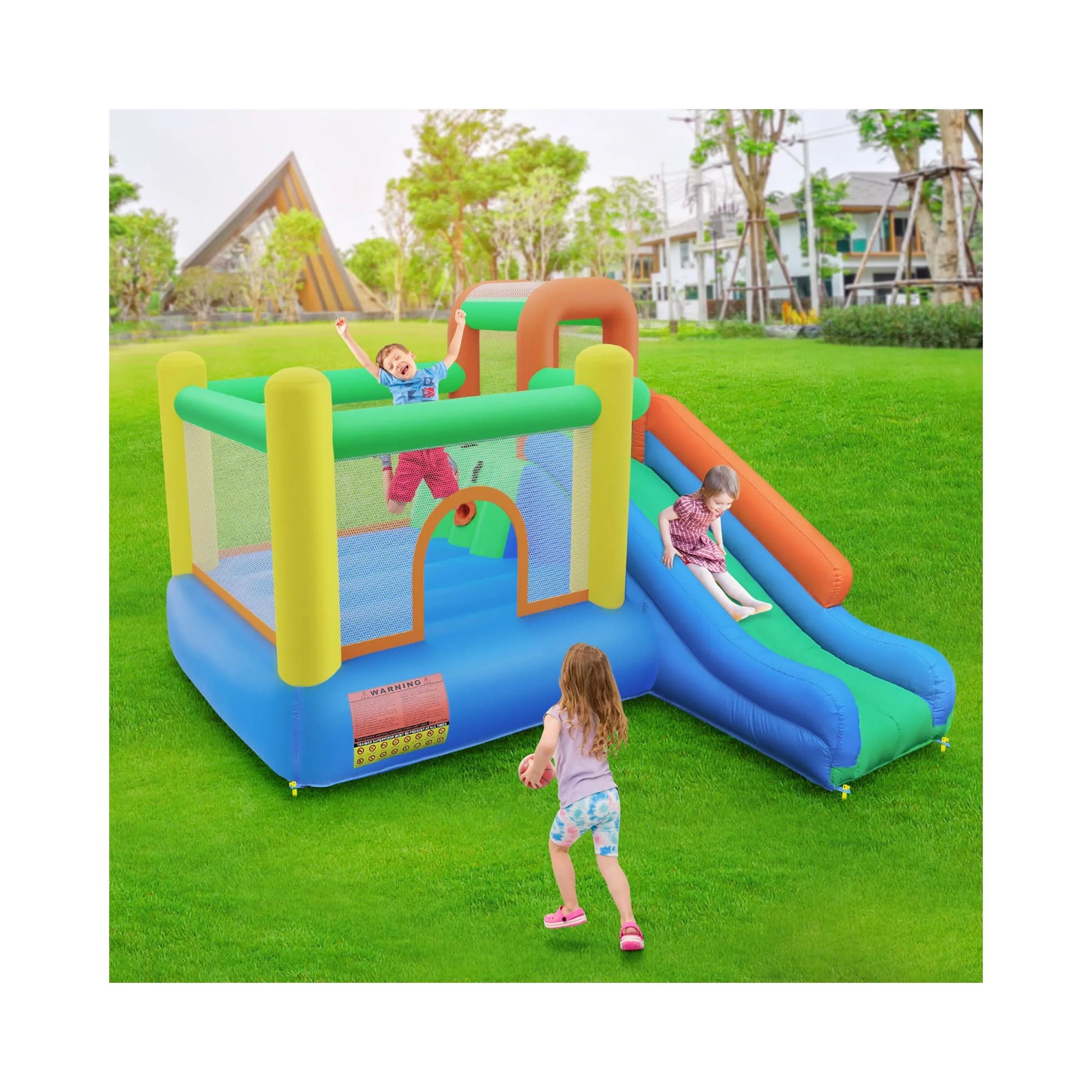 • Multiple Funny Play Areas:This Amictoy Inflatable Bounce House Castle combines multiple functions and entertainment functions, and has multiple areas for children to play. Inflated size: L 110" x W 110" x H 75". Including large jumping area, long slide area, climbing wall, basketball shot area brings different fun. You can let your child use it indoors or outdoors in summer or winter.
